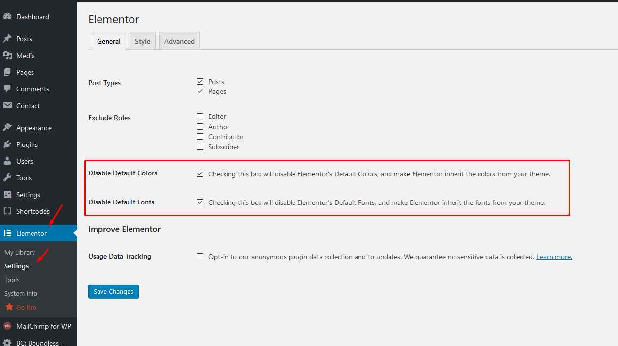 Basic setup of this plugin is very easy; go to Elementor > Settings and disable default color and fonts: