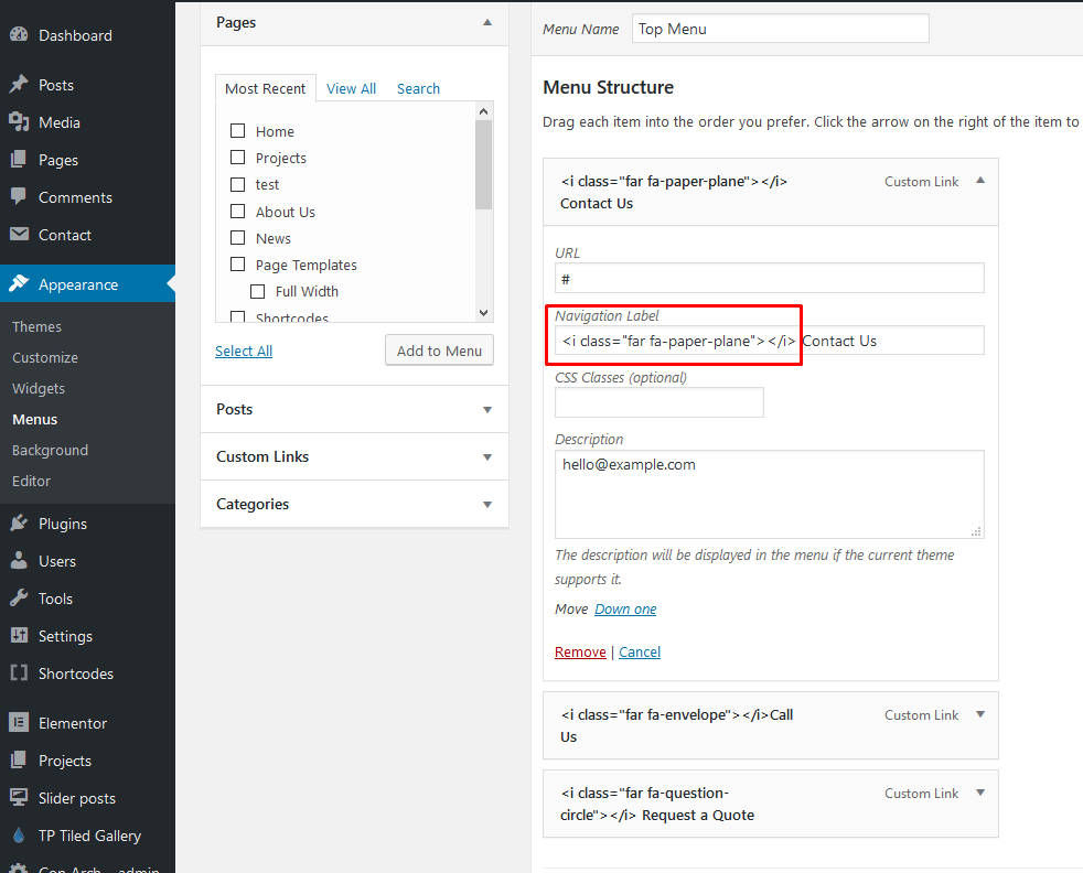 3. Toggle any menu item and type special word into 'CSS Classes' field