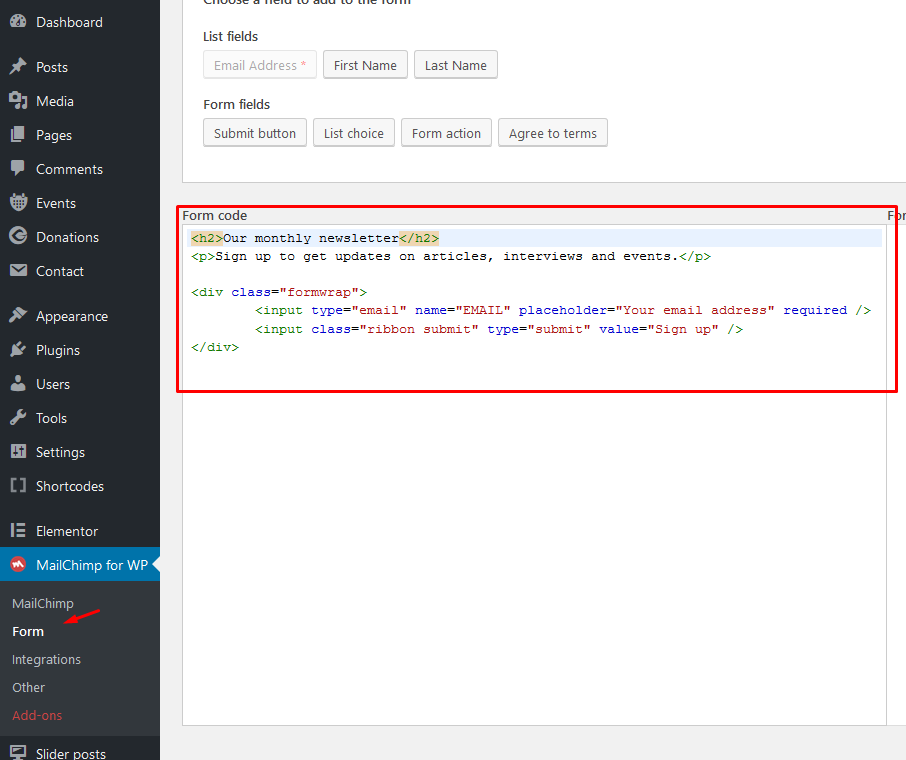 Into search field (in Plugins > Add New) paste MailChimp for WordPress and Install this plugin