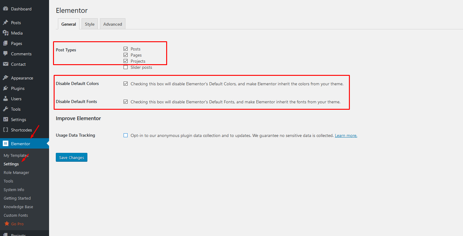 Basic setup of this plugin is very easy; go to Elementor > Settings and disable default color and fonts: